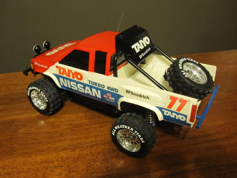 Taiyo Nissan Hard Body 4x4 Twin Motors,  tested and in working order, includdes Tyco Pistol Grip controller. It does have some sticker ware/damage, the right side stickers have some fading. There was some light corision in battery compartment but it has been cleaned up. A very cool looking truck and very rare!
