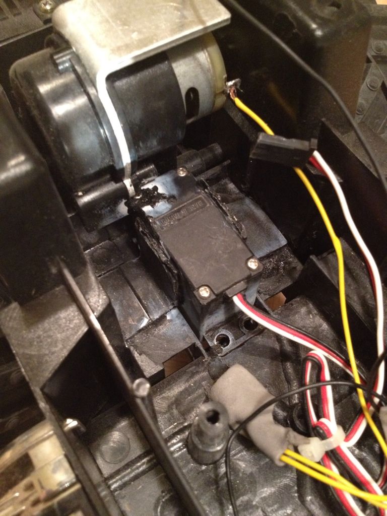 I thought it would be nice to have one I would once again be excited to drive so I took a solid chassis and started the hobby conversion. Mounting the electronics was the easy part, mounting the steering servo took a bit of careful cutting to ensure the steering was aligned and very strong. I used a metal gear servo so I wouldn't have to replace it twice and fit the stock servo arm onto the hobby arm for the correct steering, it worked well.