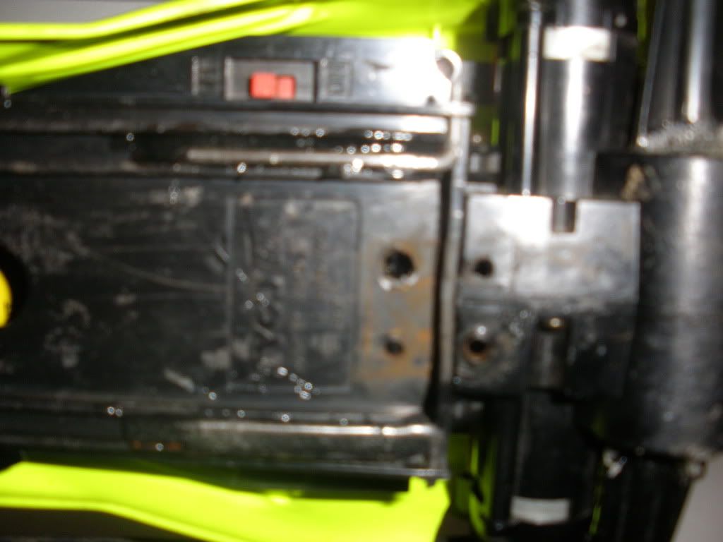 Next is the yellow fast traxx. I replaced the engines, a stripped gear, the antenna, the front end(since it was a really rusty axel and one wheel was kinda fixed with glue), and i replaced the rear wheels with nicer ones. in two of the pictures you see there is glue around the gear box. this isn't because it was cracked, but because it look like those areas had gotten melted so it is just for reinforsement. runs well now that the motors aren't rusted ones. missing front tyco sticker. It is a solid car though. And you will see the battery door did have a hinge rivited on, now you can see i used finishing nails as hinges.