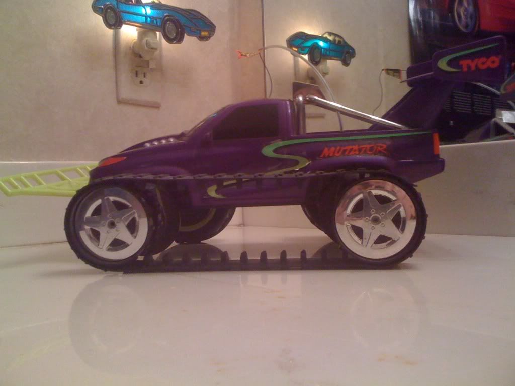 Here is my next project called the mutator traxx. I will be making adapters to fit the fast traxx wheels to the mutator unless I can find a wheel that bolts on and doesnt stick out too far. Whats awesome is that it will have a ton more ground clearance than a fast traxx, the best part about it is I will be able to adjust the traxx tension from the remote so no more loose flappy treads. The truck will stay in one position only using the button for belt tension. If I find the right wheels I will make it to where it can be mutated from street to off-road mode Here is a pic of what it could look like.