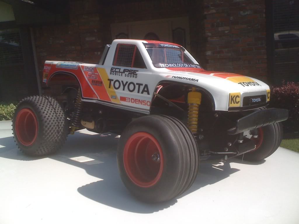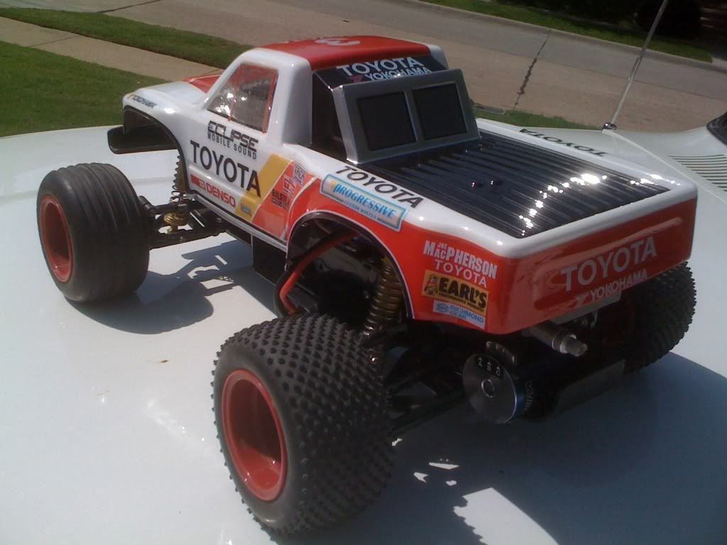 This is my Tamiya Monster Racer that I just got done fixing up with a new body I painted, new original wheels, pro-line tires and a traxxas brushless setup with fm radio. They made these back in 1989 and I think this is one my top 3 favorite looking trucks of all time. Its so powerful with the 5000mah 8.4v battery that it pulls wheelies at any speed. I machined a rear differential housing for it 3 years ago out of 6061 aluminum to replace the weak pot metal diff that cracks.