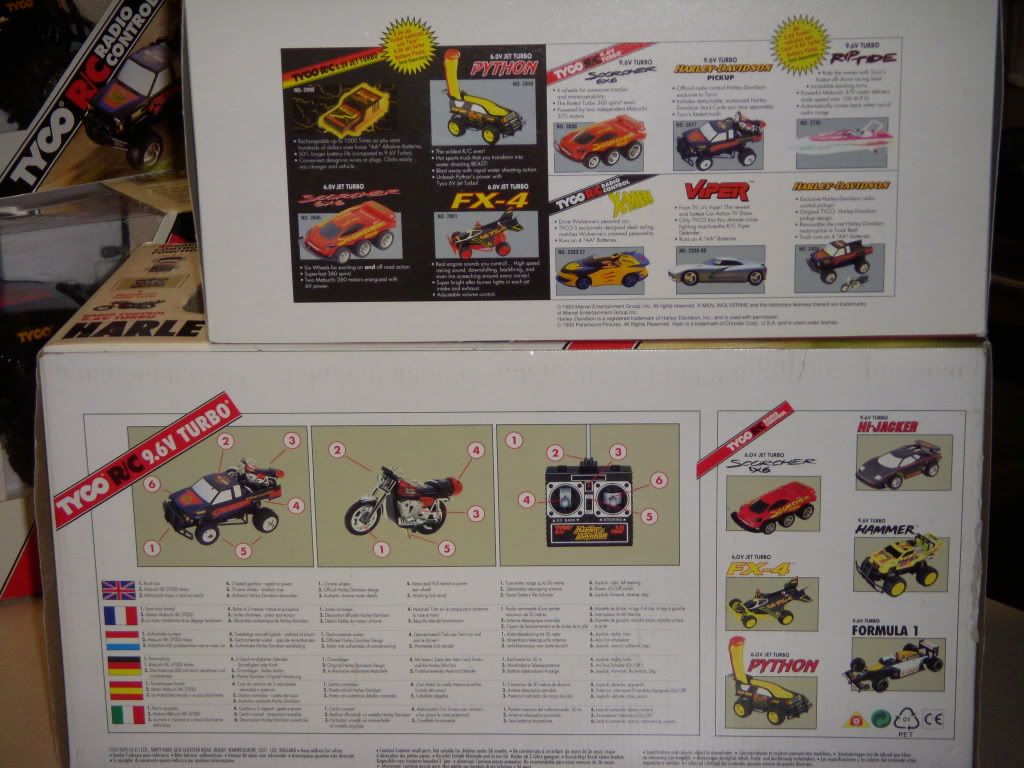 so there really was some vintage tyco's under my tree this year lol,,my loving wife got me 5 this year!!!! where she found them i don't know because i watch ebay and craigslist like a hawk lol but anyways she knew i had the mini for years but didn't know i had finally found a new in box 9.6v Harley truck recently so she found me the pair for Christmas so they are up for sale here first. i could put them on ebay and they would sell in a heartbeat but I'm just making sure any of you guys don't want them first. i am asking $250 firm + shipping as i just paid more than that for the 9.6v i just bought by itself.I'm positive the pair would bring more than that on ebay but I'm not trying to break any banks here just trying to give someone here a good deal,,both trucks are brand new never run,,the 9.6v was sealed i opened it myself to blow all the dust off because it was covered in thick dust because the cellophane was missing,what i found is something Ive never seen before the box came from the factory without it,,,i thought it had just fallen out over the years as many do but there is absolutely no glue lines inside the box and its factory fresh inside,its just blew my mind because I'd never seen that before anyways because of this it has yellowed the Styrofoam a little,,but the truck is A-1 (0 chrome fade,0 sticker peel,0 tire whiting etc) if you need any more pics please just let me know fellas