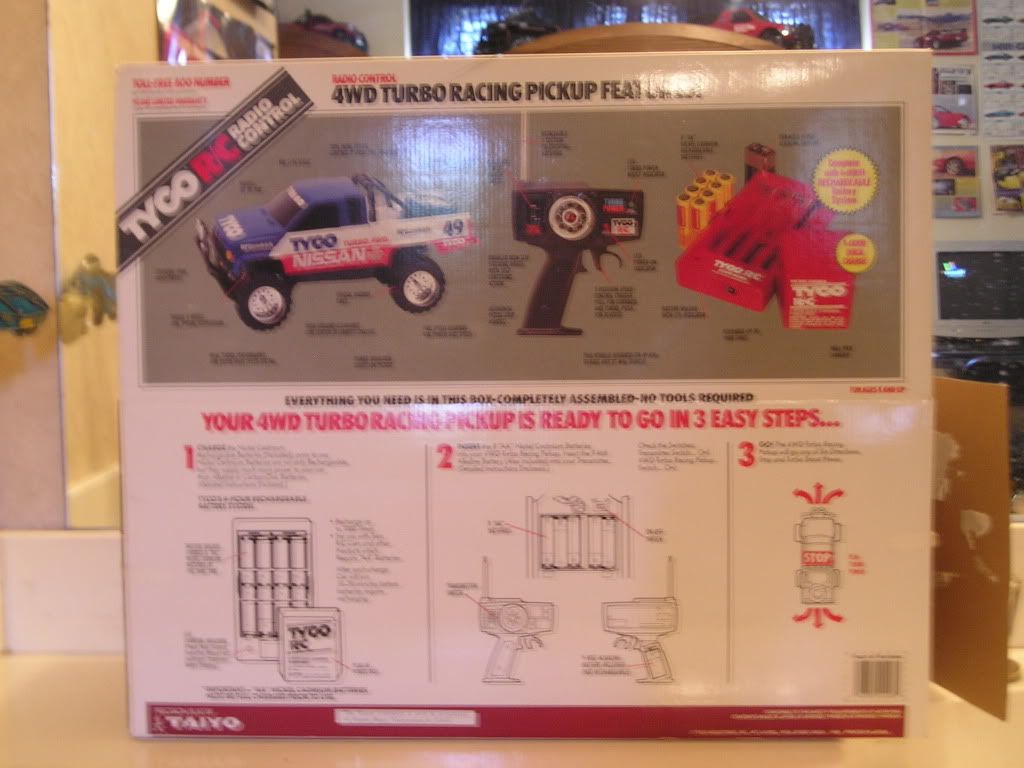 The name of the truck is the "4WD TURBO RACING PICKUP" and it was made in 1988 only. I actually still have the original charger and batteries and they still hold full charge lol, no corrosion whatsoever! Im kinda jealous, youve got the red one. I saw one on ebay a while back and forgot to watch the auction end so I missed it. Ive had this one for about 5 years and its the only one new in box ive ever seen.  Heres a better view of the box
